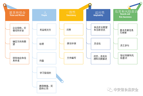 将食品安全文化分为五个维度:愿景和使命、人、一致性、适应性和危害和风险意识。这五个维度涵盖了组织内部和外部的各个方面,要求企业从领导层到操作人员都践行食品安全的理念,负责报告发现的问题,并赋能实施改变。